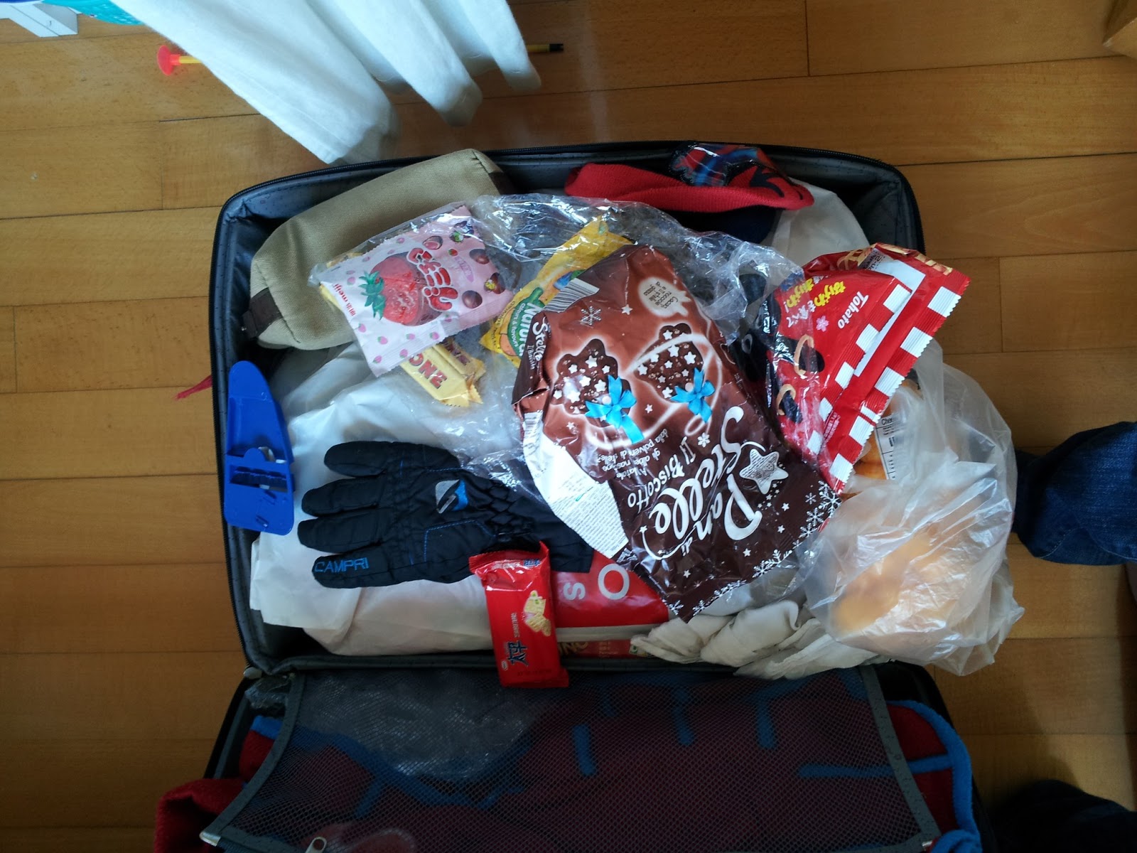 Opened the suitcase. All snacks and treats found a way back home! Guess no hunger pangs at night.
