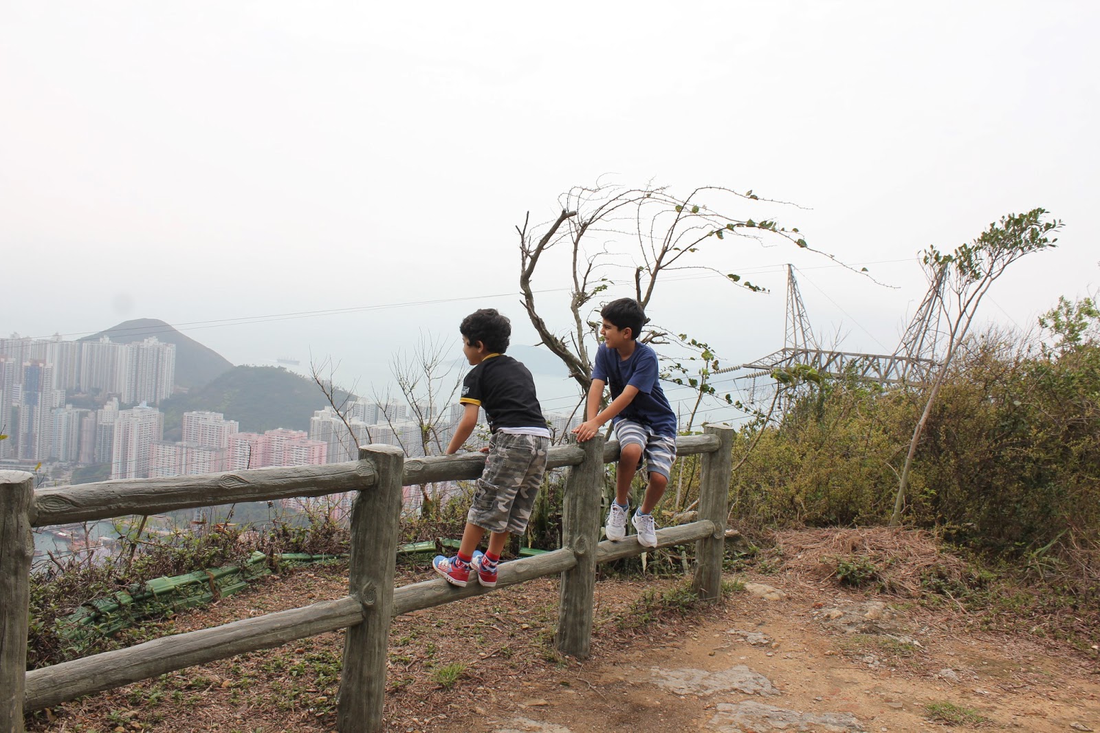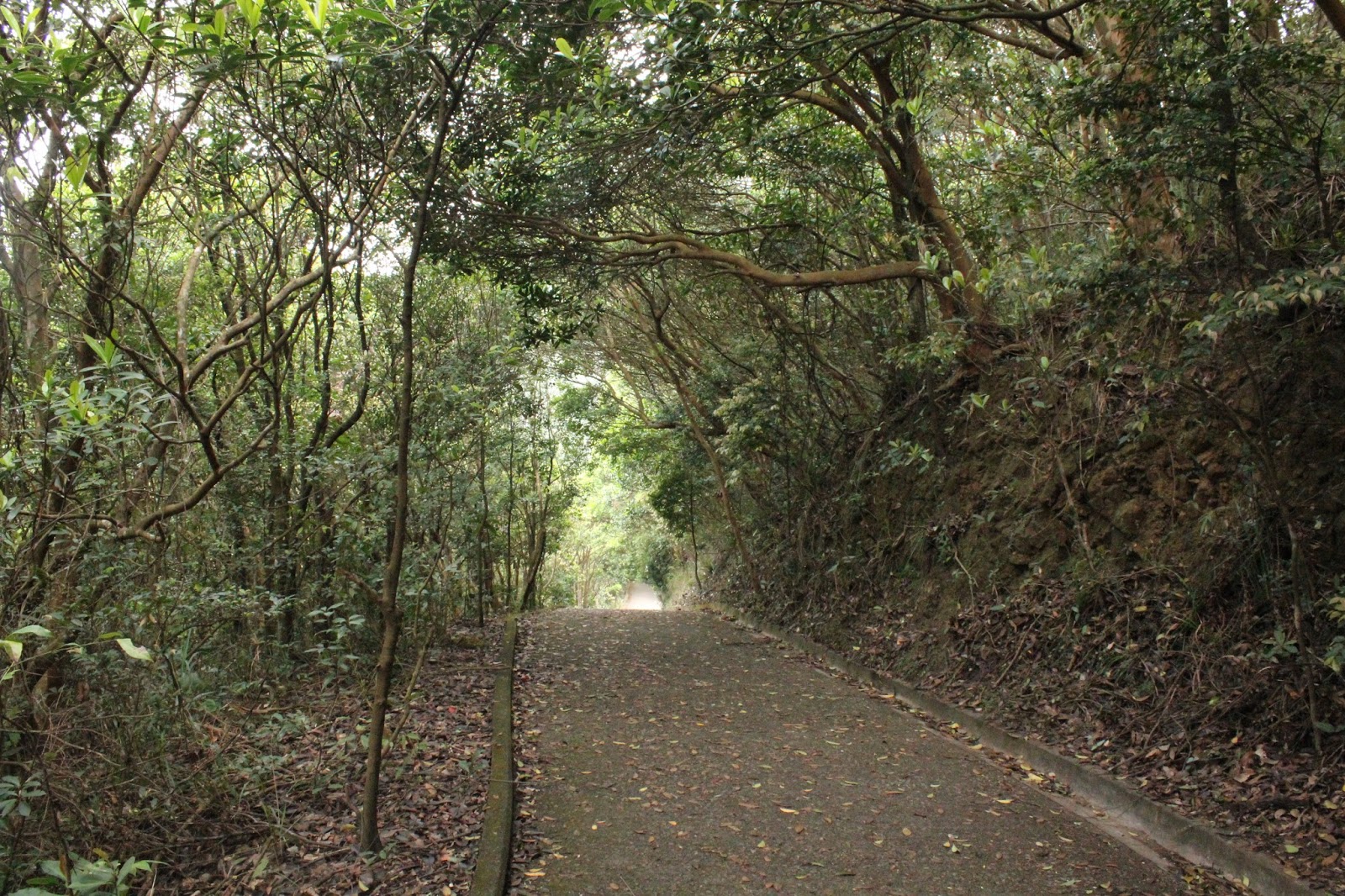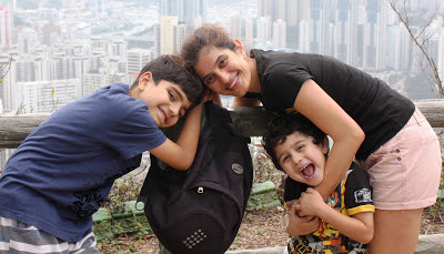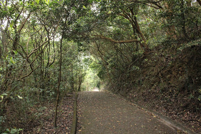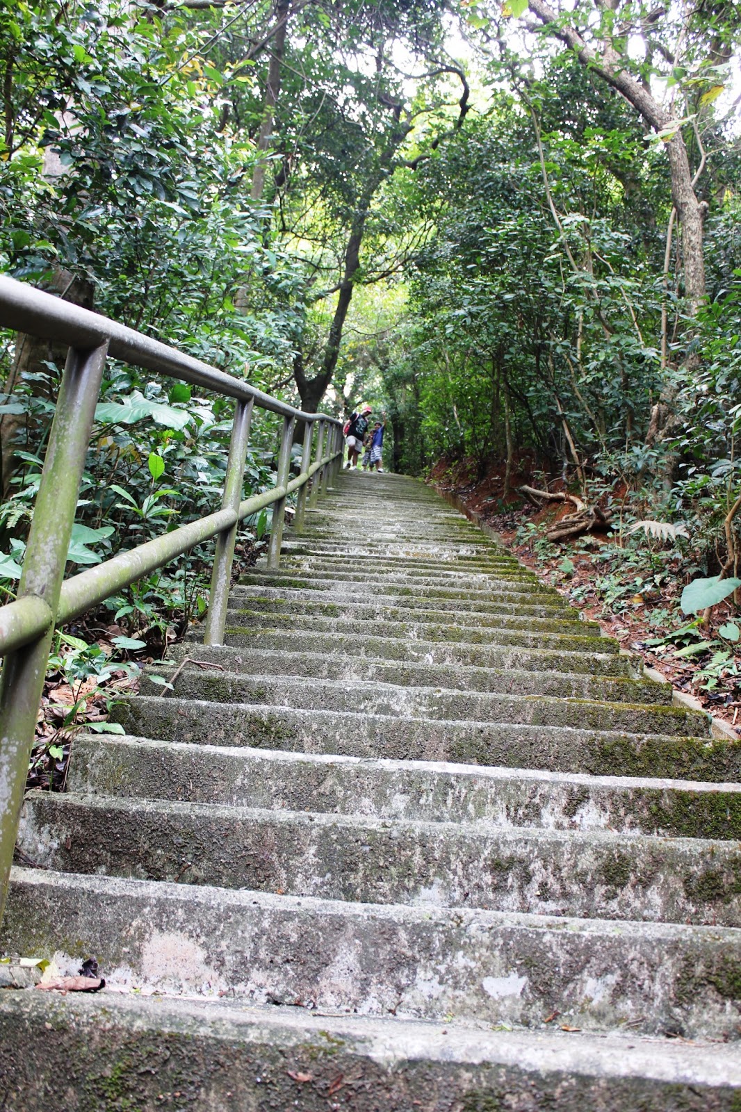 So one holiday instead of going for the usual food and fun kind of outing, we decided to take a ”little stroll” in our neighbourhood. We left home a little before 11 am carrying our rain jackets in a haveasack (it looked like a cloudy day), our food supply consisting of some crackers, a banana, two bottles of Yakult and a bottle of water. I was also carrying my Canon EOS 550D camera in a separate camera bag along with my wallet and a few must-haves like tissues, hand sanitiser, lip balm and chewing gum! We had decided to do the tried and tested route up to the Peak as before which involved taking a bus to Pokfulam Reservoir and then hiking up from there. However when we came to the bus stop, my husband spotted some steps going up the mountain on the opposite side of the road and on the spur of the moment he decided that we were going to take that route! Now although I had never walked up this path I did remember a friend telling me that she had and that it does lead to the Peak and involved some 500 steps. I am not very fond of steps actually and prefer walking up a slope instead, but this was a good change from routine. So we crossed the road with the boys and started the ascent.